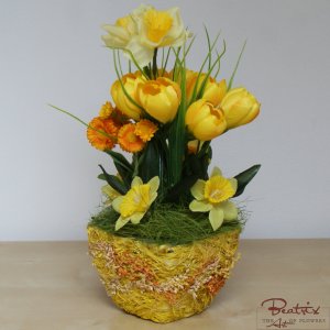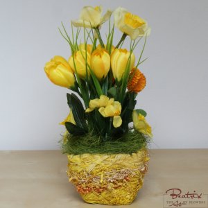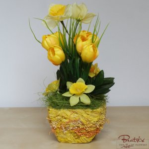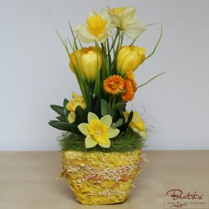 Denumire flori: narcise, branduse (crocus), banutei; aspect: natural; culori: galben; materiale: textile, tije din plastic cu insertie metalica. Decoratiuni naturale uscate: sisal.